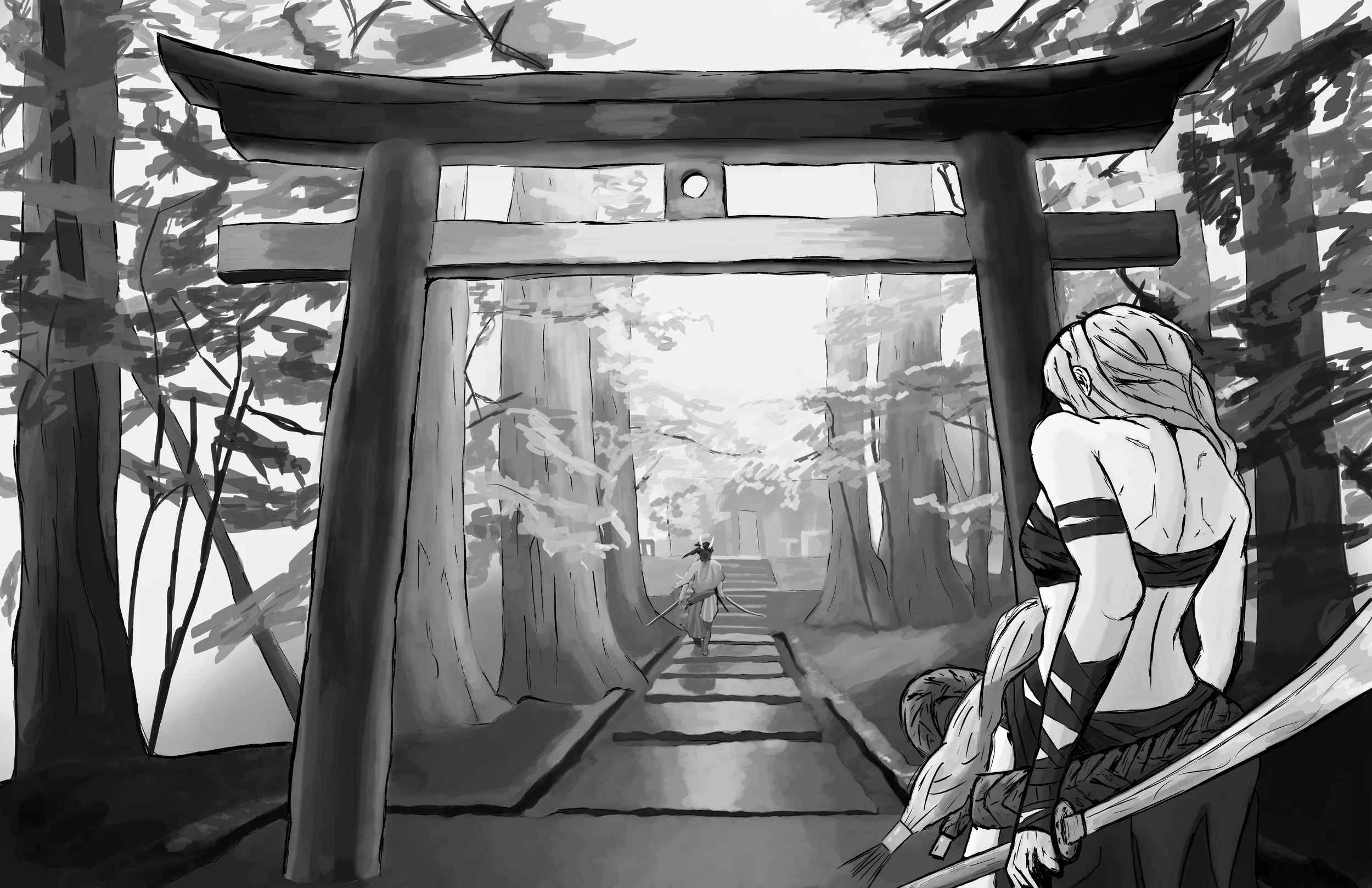 A scene composed during a study of perspective, I wanted to create something dramatic and mysterious. This would be a work that would utilize both my digital painting techniques as well as my illustration techniques. I have a personal tendency towards “show, don’t tell” storytelling, and art is a perfect vessel of that. The idea of a mythological Japanese folktale scene came to mind, something that someone could imagine when told about a wandering warrior or the events leading up to a fight of destiny. I used real world references of Japanese temples, the main thing in mind being the famous Torii gates of Shinto shrines, and began blocking up basic shapes for the scene.